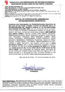 O Sindicato dos Bancários de Rio Preto e região realizará assembleia extraordinária específica nos dias 11 e 12 de novembro de 2025, para que os bancários beneficiários titulares do Saúde Caixa, sócios e não sócios, deliberem sobre a aprovação do Acordo Coletivo de Trabalho (ACT) Saúde Caixa 2026.