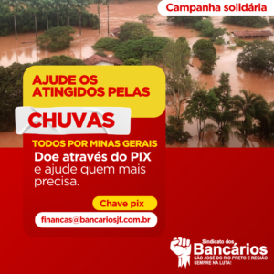 O Sindicato dos Bancários de São José do Rio Preto e região reforça o apoio à campanha organizada pelo coletivo Sindicato Solidário, da Contraf-CUT, em solidariedade às famílias atingidas pelas fortes chuvas em Minas Gerais.