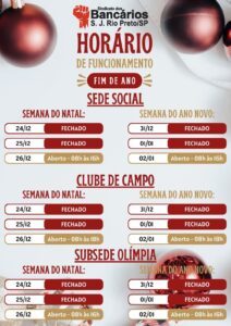 O Sindicato divulgou os horários especiais de funcionamento de suas unidades durante as semanas do Natal e do Ano Novo. A programação inclui a Sede Social, o Clube de Campo e a Subsede de Olímpia, que terão alterações nos atendimentos devido ao período festivo.