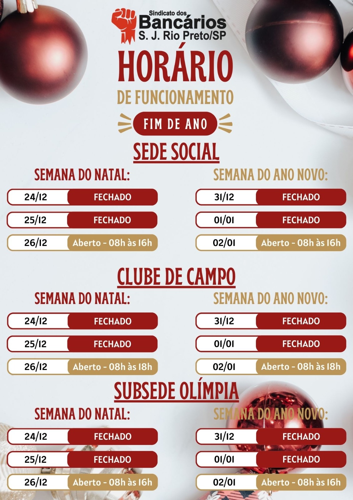 O Sindicato divulgou os horários especiais de funcionamento de suas unidades durante as semanas do Natal e do Ano Novo. A programação inclui a Sede Social, o Clube de Campo e a Subsede de Olímpia, que terão alterações nos atendimentos devido ao período festivo.