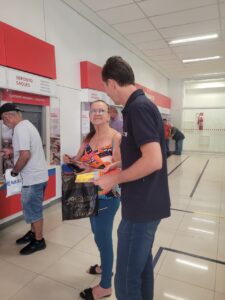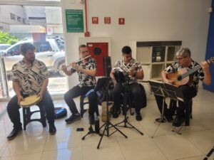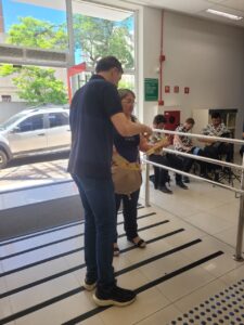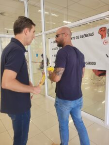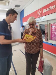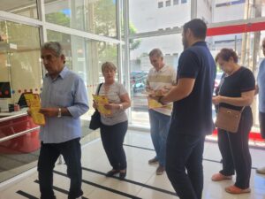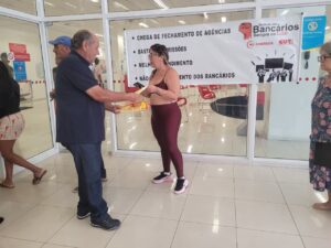 Durante a atividade, dirigentes sindicais dialogaram com a população e distribuíram materiais informativos explicando os impactos das políticas adotadas pelo banco, que tem causado sobrecarga aos bancários e ampliado as dificuldades para quem depende de atendimento presencial.