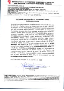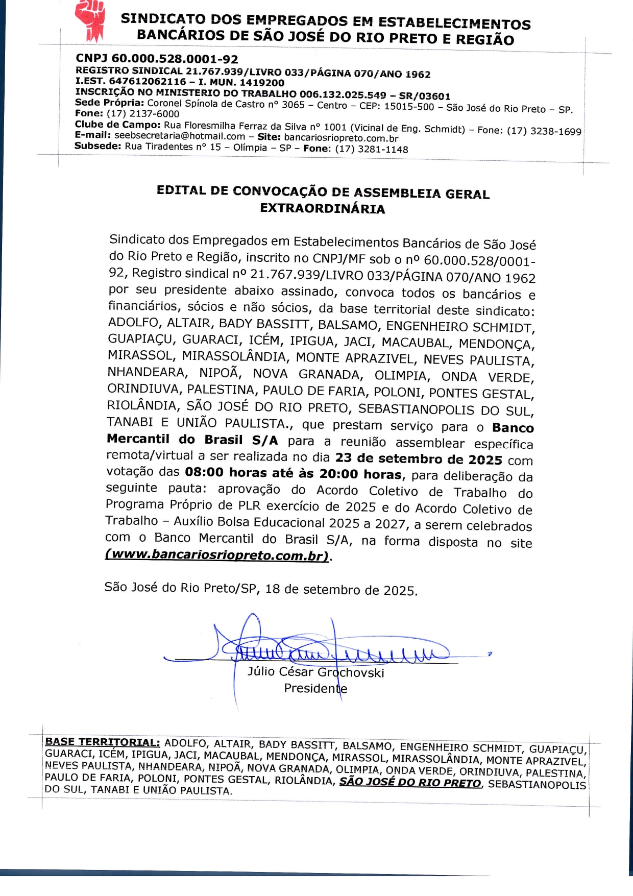Sindicato dos Empregados em Estabelecimentos Bancários de São José do Rio Preto e Região, inscrito no CNPJ/MF sob o nº 60.000.528/0001-92, Registro sindical nº 21.767.939/LIVRO 033/PÁGINA 070/ANO 1962 por seu presidente abaixo assinado, convoca todos os bancários e financiários, sócios e não sócios, da base territorial deste sindicato: ADOLFO, ALTAIR, BADY BASSITT, BALSAMO, ENGENHEIRO SCHMIDT, GUAPIAÇU, GUARACI, ICÉM, IPIGUA, JACI, MACAUBAL, MENDONÇA, MIRASSOL, MIRASSOLÂNDIA, MONTE APRAZIVEL, NEVES PAULISTA, NHANDEARA, NIPOÃ, NOVA GRANADA, OLIMPIA, ONDA VERDE, ORINDIUVA, PALESTINA, PAULO DE FARIA, POLONI, PONTES GESTAL, RIOLÂNDIA, SÃO JOSÉ DO RIO PRETO, SEBASTIANOPOLIS DO SUL, TANABI E UNIÃO PAULISTA., que prestam serviço para o Banco Mercantil do Brasil S/A para a reunião assemblear específica remota/virtual a ser realizada no dia 23 de setembro de 2025 com votação das 08:00 horas até às 20:00 horas, para deliberação da seguinte pauta: aprovação do Acordo Coletivo de Trabalho do Programa Próprio de PLR exercício de 2025 e do Acordo Coletivo de Trabalho – Auxílio Bolsa Educacional 2025 a 2027, a serem celebrados com o Banco Mercantil do Brasil S/A, na forma disposta no site (www.bancariosriopreto.com.br).
