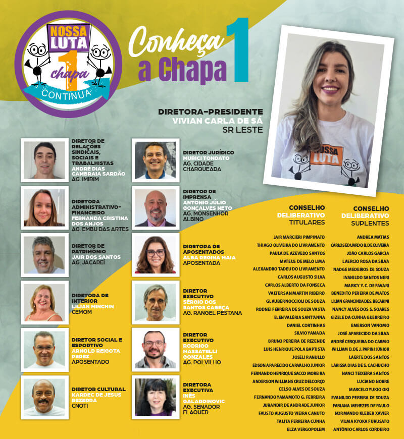 As eleições para a diretoria e o Conselho Deliberativo da Apcef/SP serão realizadas no dia 16 de abril (quinta-feira). O Sindicato dos Bancários de Rio Preto e Região apoia à Chapa 1 “Nossa Luta”, encabeçada por Vivian Carla de Sá, da SR Leste, candidata à presidência da entidade.