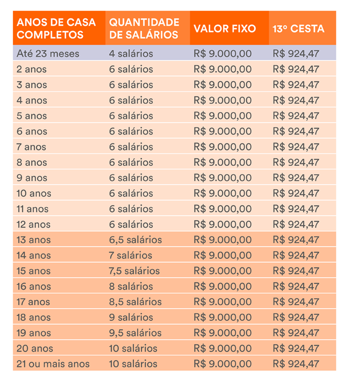 Piso de 6 salários + ½ salário por ano trabalhado, com teto de até 10 salários + valor fixo de R$ 9 mil + 13ª cestaalimentação.*