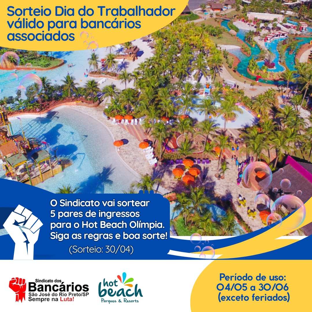 Em comemoração ao 1º de Maio, Dia do Trabalhador, o sindicato preparou uma ação especial para valorizar os seus associados: o sorteio de 5 pares de ingressos para um dia de lazer e descanso no Hot Beach, em Olímpia.