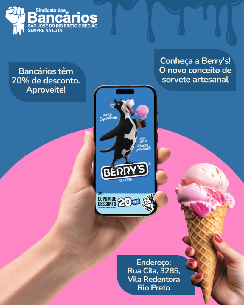 O Sindicato dos Bancários de Rio Preto e Região tem uma novidade deliciosa para os seus associados. Agora, todos podem aproveitar 20% de desconto na Berrys Rio Preto, referência em sorvete artesanal na cidade.