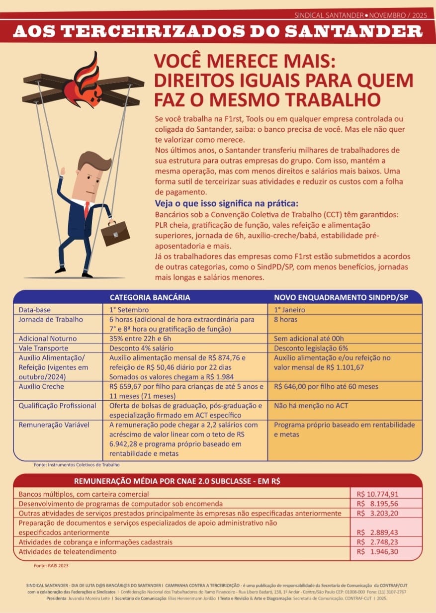 “Os trabalhadores estão cada vez mais pressionados por metas abusivas. O banco precisa valorizar quem constrói seus resultados, e não promover cortes e precarização”, destacou Daniel Vitolo, funcionário do Santander e diretor do Sindicato.
